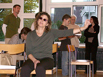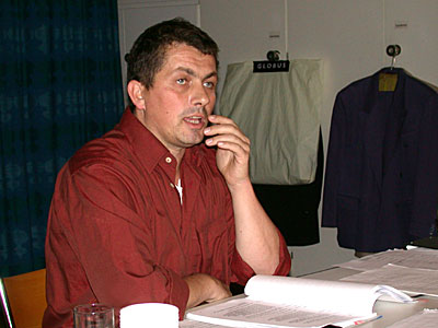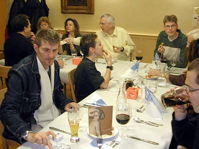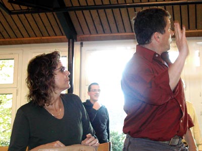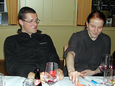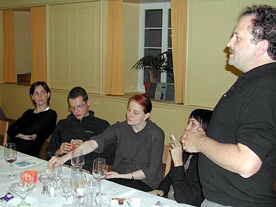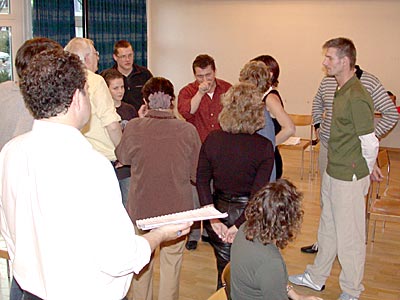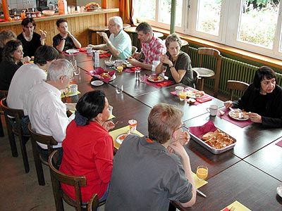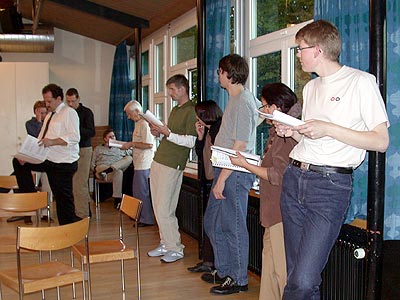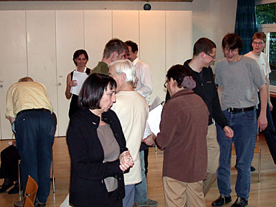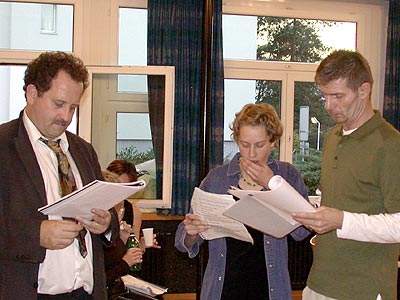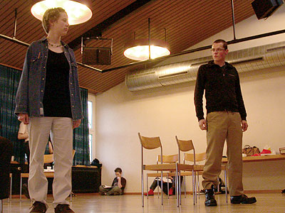Schon längst wird geprobt, aber mit den Fotos hat es erst kürzlich hingehauen. Am ersten grossen Probenwochenende Anfang November ging es in Schwamendingen feuchtfröhlich zu und her. Die "Hochzeitsfahrt" spielt nämlich auf dem Schweizer Dampfschiff "Blüemlisalp", und dieses planscht - in Ermangelung grösserer Binnengewässer - auf dem Brienzersee herum. Weil Regisseur Björge die die SchauspielerInnen gleich ins kalte Wasser schubst, halten die sich vorerst tapfer an ihren Rettungsringen... äh... Textbüchern fest. Wie bei so Reisen üblich, standen neben der eigentlichen Probenarbeit auch ein gemeinsames Abendessen mit anschliessendem Frühstück auf dem Programm.