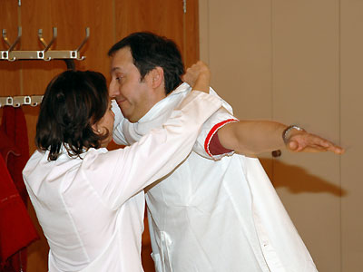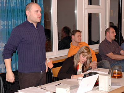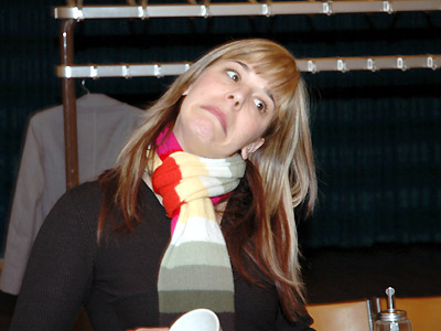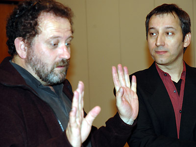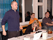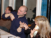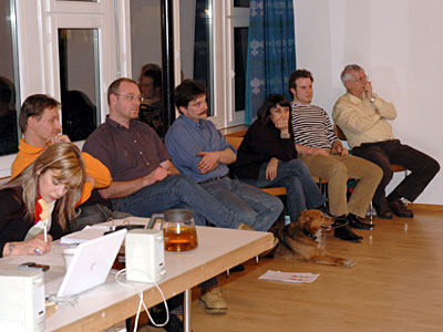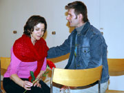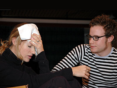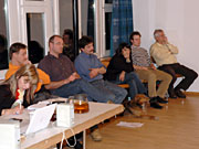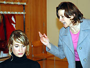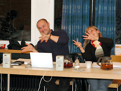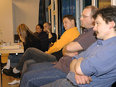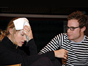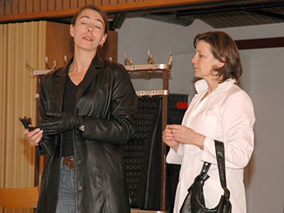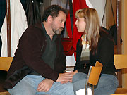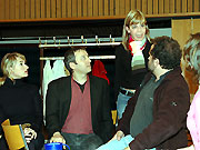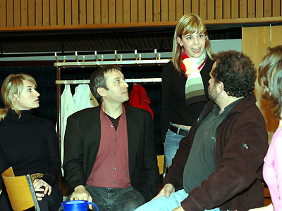 Die Premiere naht, und es wird geprobt wie verrückt. Langsam aber sicher kommt der richtige Text zur meistens richtigen Zeit. Die Gänge, die Pausen, die Wechsel im Bühnenbild - alles nimmt Form an, und langsam erkennt man - auch als Spieler - den Zusammenhang, die logische Abfolge der Bilder und Szenen. Die Probe vom 15. Februar war eine so genannte "Sichtprobe". Als Zuschauer anwesend waren deshalb auch VertreterInnen der "rückwärtigen" Dienste wie Kostüme, Licht, Ton etc. Hier nun ein paar Eindrücke, die Martin Stocker für die Nachwelt festgehalten hat.