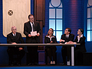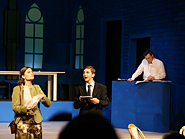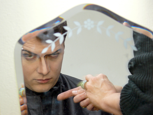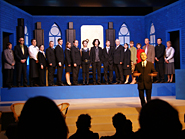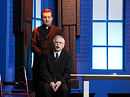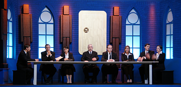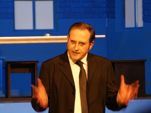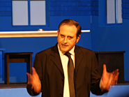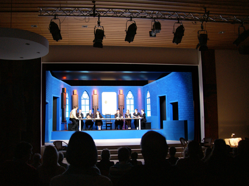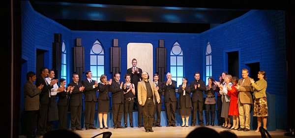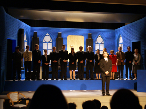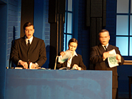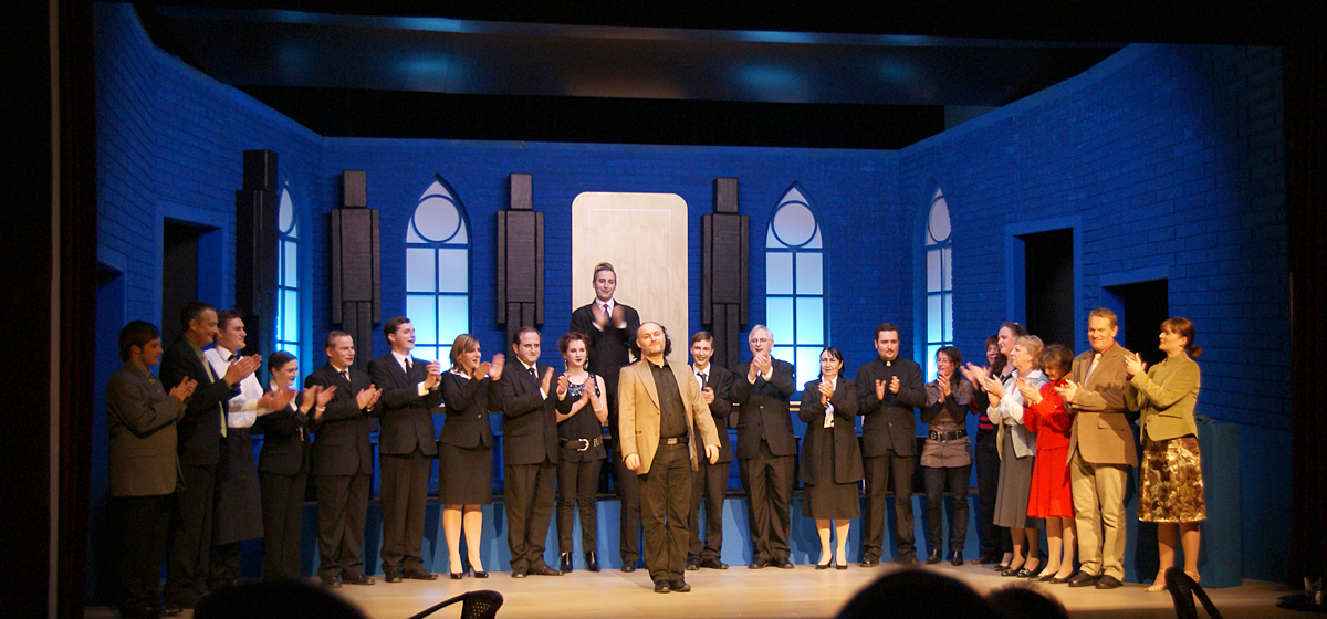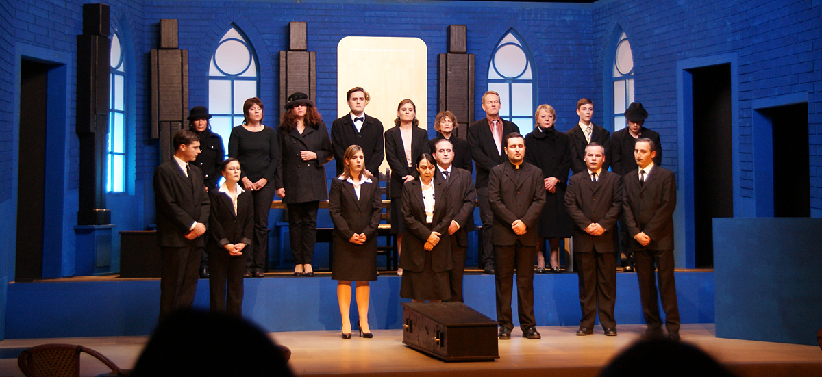 Noch bis zur Pause wurden letzte Dekor- und Requisitenteile gemalt. Am späten Nachmittag musste auch die Saalbestuhlung eingerichtet und nummeriert werden. Die Lounge erhielt den letzten Schliff und alles Überflüssige wurde verstaut. Während die Maskenbildnerinnen bereits auf Hochtouren die 20 Spielerinnen und Spieler unter ihre Schwämme und Pinsel nahmen, wurde im Foyer das Buffet aufgebaut und das «Personal» instruiert. Gegen halb acht fand für die Spieler das obligatorische und sehr wichtige «Einsingen» statt und mit nur einer Viertelstunde Verspätung (für eine Premiere ist das sicher akzeptabel) ging schliesslich das Saallicht aus und die Bühnenbeleuchtung an. Koni Weiss am Klavier spielte seine Eröffnungsfanfare und damit galt es Ernst. Das war der Premierenabend im Kirchgemeindehaus Schwamendingen mit der ersten Aufführung der Jubiläumsproduktion «Frank der Fünfte».