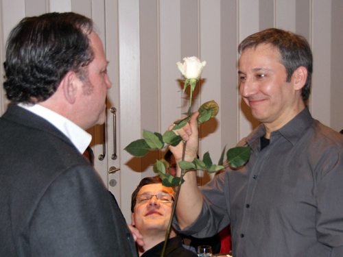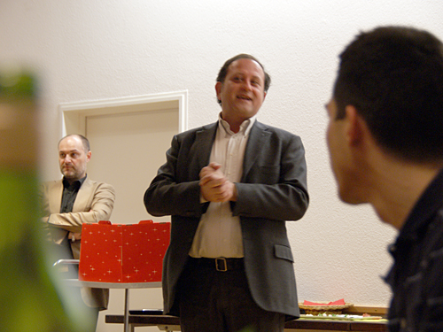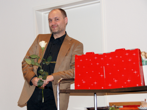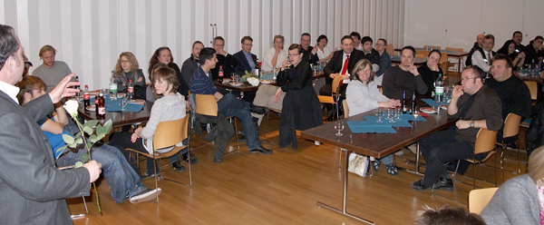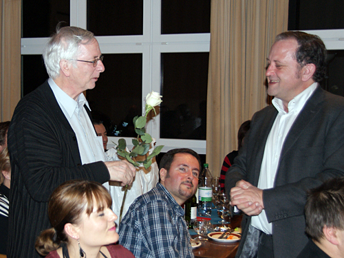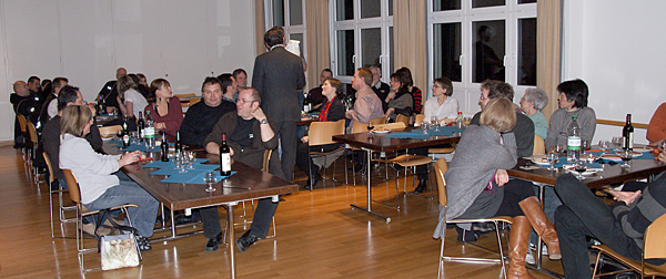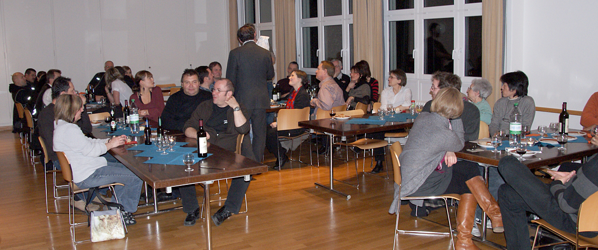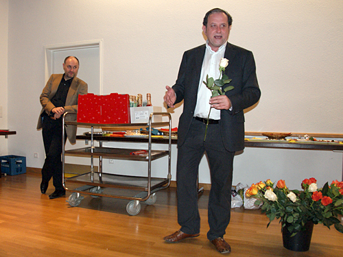 Nach dem Schlussapplaus einer praktisch fehlerfreien Vorführung lud Präsident Michael Karch alle Anwesenden zur traditionellen Premierenfeier in den kleinen Saal. Dort wurde gegessen, getrunken, getratscht und gelacht, und es gab Verdankungen und Blumen. Langsam wich der Druck und Stress der letzten Wochen einer fröhlichen Gelassenheit. Von jetzt an darf lustvoll gespielt und genossen werden. Und da unser «Frank» beim Publikum offenbar Anklang findet, freuen wir uns alle auf die weiteren Vorstellungen.