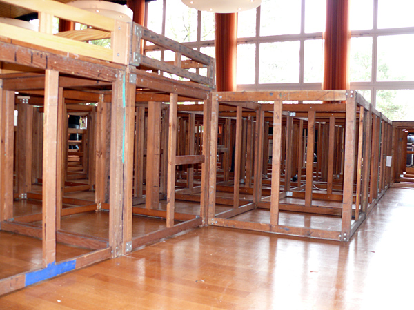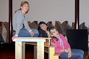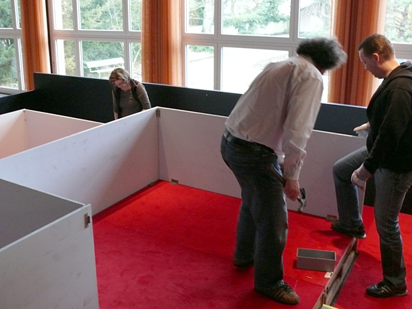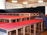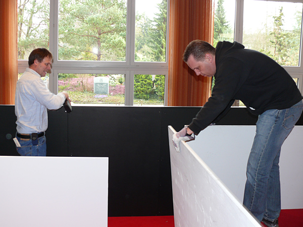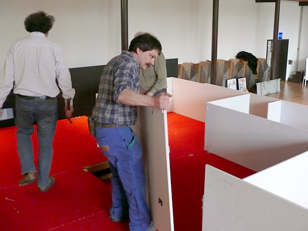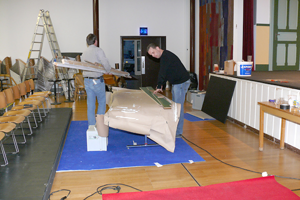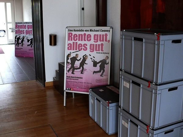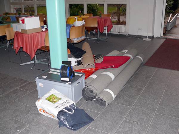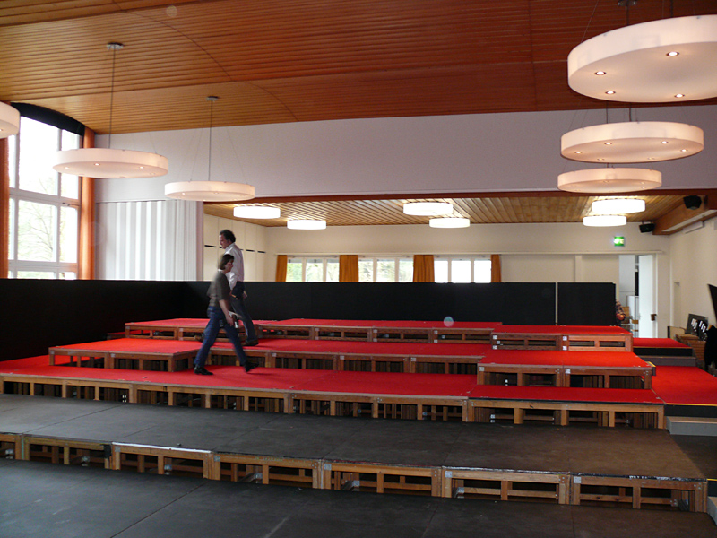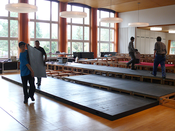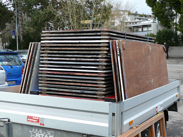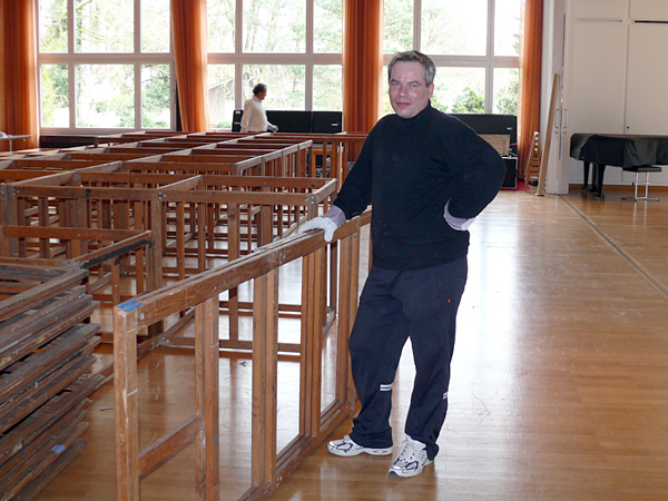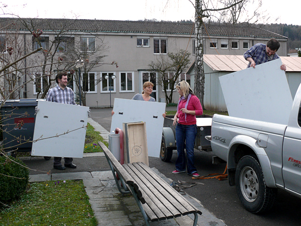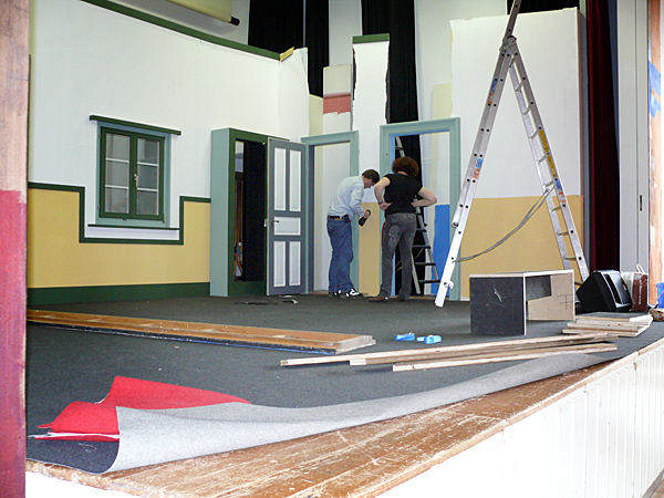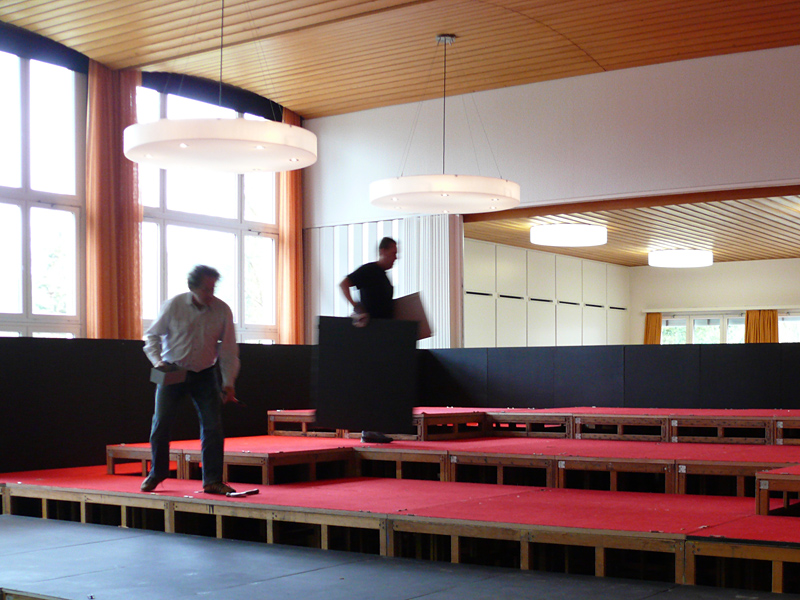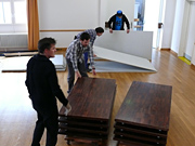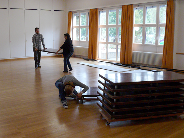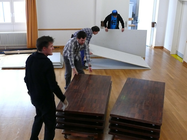 Der letzte Vorhang ist gefallen, die Blumen sind verteilt, die Flaschen geleert und auch die letzten Gäste endgültig nach Hause gegangen. Nur wir sind noch nicht ganz fertig. Noch steht das aufwendige Bühenbild (fast intakt) im Saal, und auch unsere luxuriöse Bestuhlung mit Podesterie und exklusivem Loungebereich muss  wieder in hunderte von Einzelteilen zerlegt und abtransportiert werden. Weil es Sonntag ist und wir den Kirchgang nicht stören dürfen, müssen wir - gottseidank - erst gegen Mittag antraben. Dann aber heisst es «Auf die Plätze, fertig, los!», und ab geht die Post. Es wir auseinandergeschraubt, zusammengelegt, abgerissen, aufgerollt, umgedreht und aufgeladen, was das Zeug hält. Viele Beine und Arme und manches Köpfchen sind nötig, damit die Logik stimmt und schliesslich alle Teile - wie beim Aufräumen eines grossen Puzzles- wieder am richtien Ort landen.