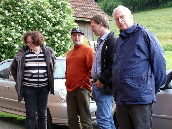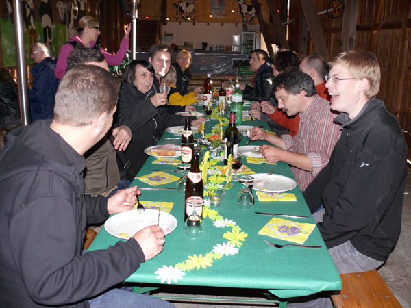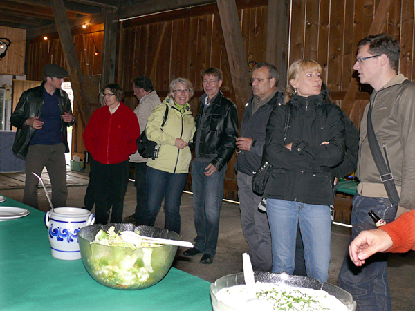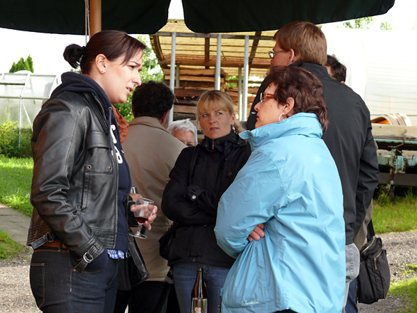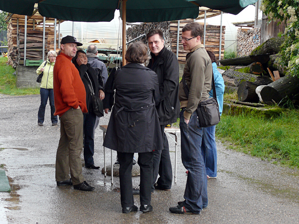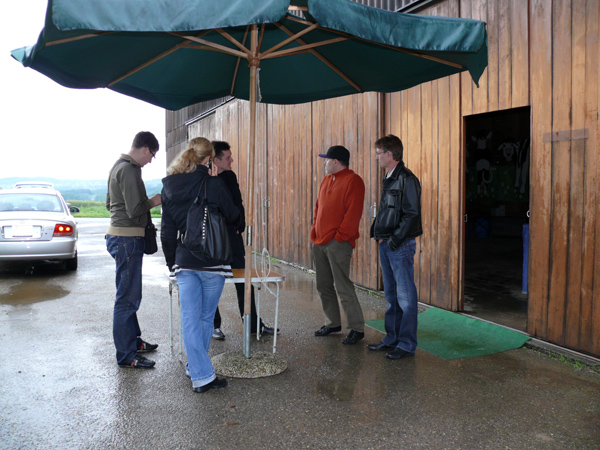 Am 19. Juni hatten wir - damit niemand von uns arbeiten muss - ein fröhliches Abendessen auf dem Stadler-Hof in Aesch / Kanton Zürich gebucht. Die gastgebende Familie Stadler hatte auch alles wunderbar vorbereitet, vom Apéro bis zum Dessert, und wir hätten das alles natürlich gerne bei abendlichem Sonnenschein vor den Toren des landwirtschaftlichen Betriebes genossen. Aber das Wetter hatte (wieder einmal) kein Erbarmen und trieb uns hinein in die grosse Scheune, die erfreulicherweise mit Heiz-Pilzen ausgestattet war und somit über ein gewisses Wärmepotential verfügte.