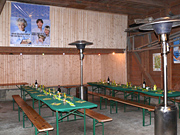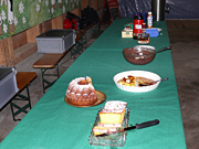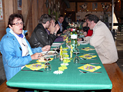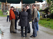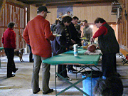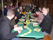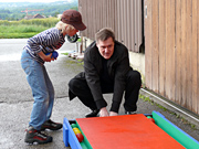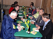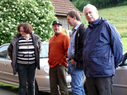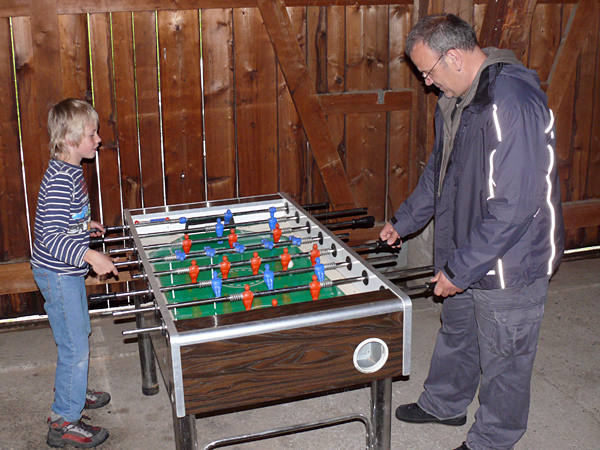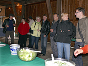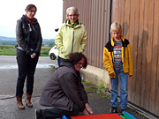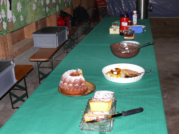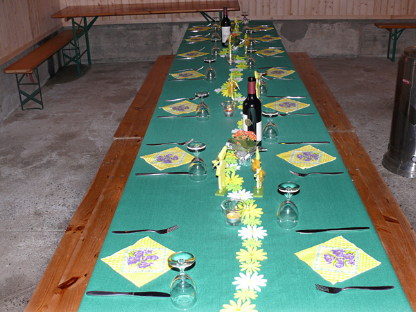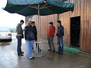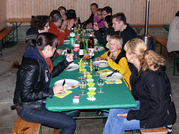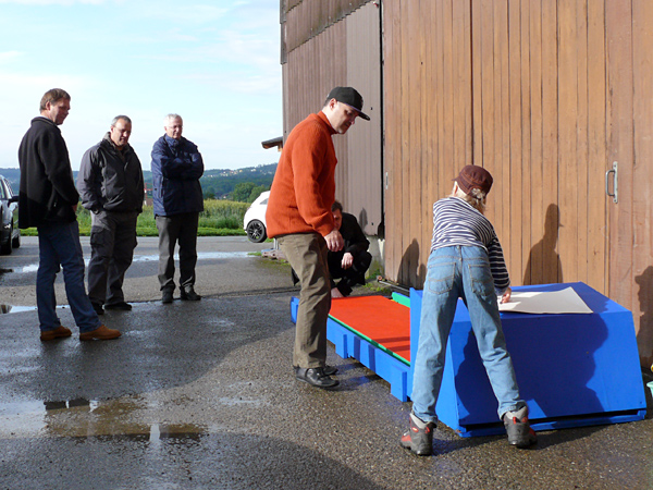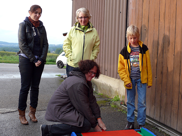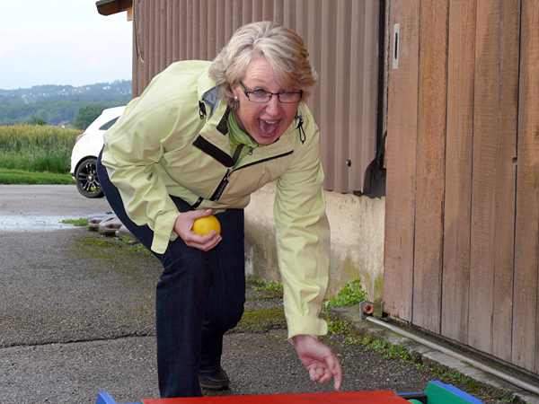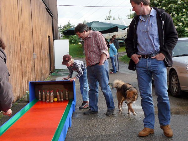 Der Kälte und Nässe trotzend nahmen wir draussen mit hochgezogenen Schultern und klappernden Zähnen den Apéro (vereinzelt ergänzt durch Glimmstängel) zu uns, später und drinnen dann den frisch gebackenen Schinken im Brotteig, den Kaffee und den Kuchen. Und, wenn es die Witterung zuliess - manchmal kam sogar etwas Sonne! - spielten wir mit der Mini-Kegelbahn, die Heinz Brehm eigens herangekarrt hatte. So vergnügten wir uns also mit Brot und Spielen und hatten dabei - Wetter hin oder her - ziemlich gute Laune. Also: «(R)Ende gut, alles gut!»