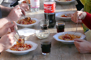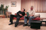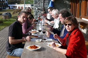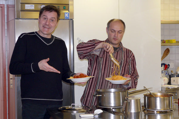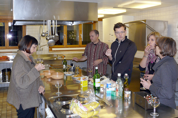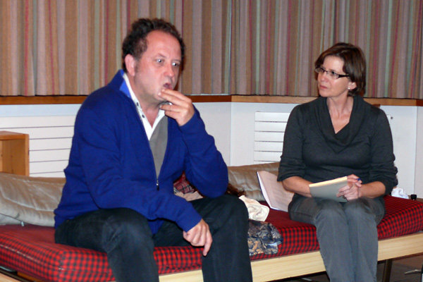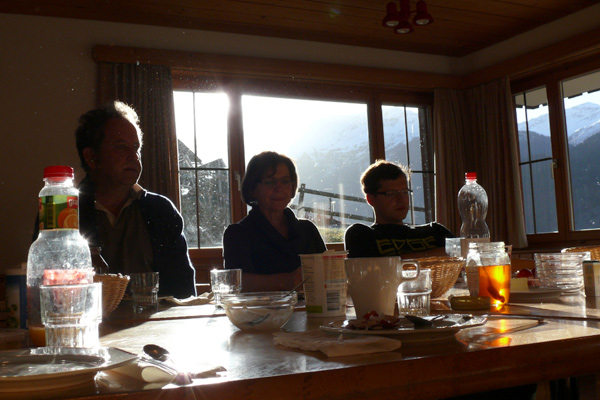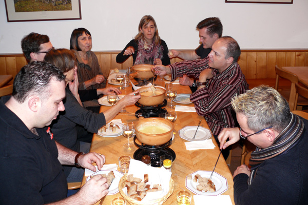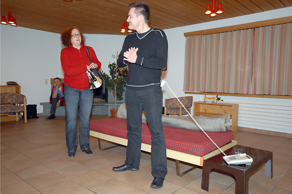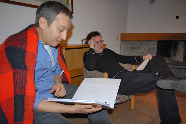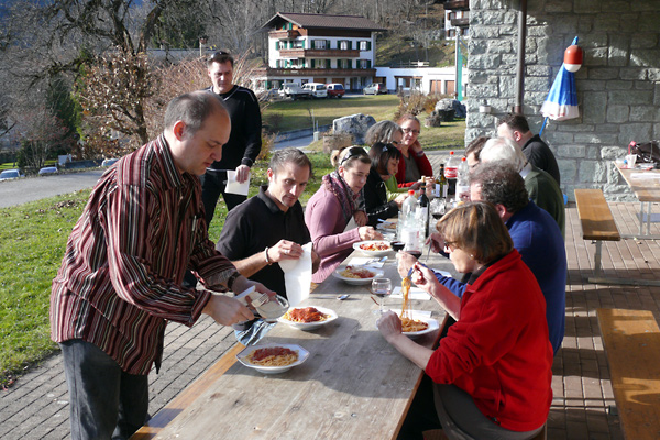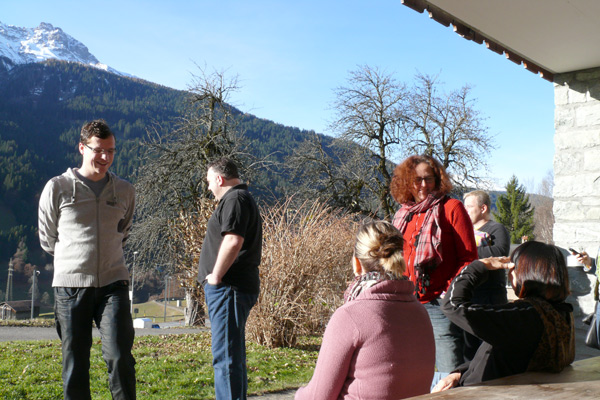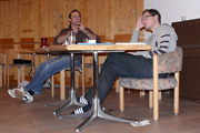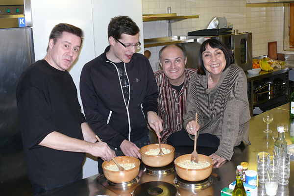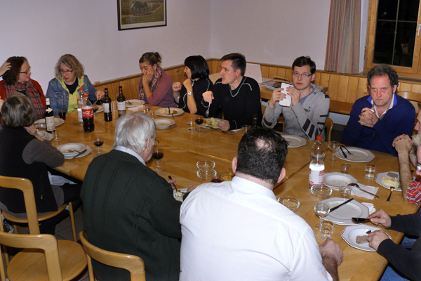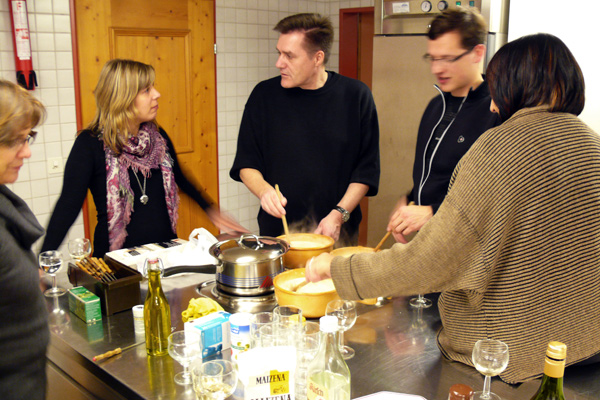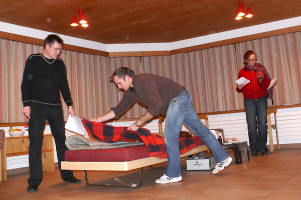 Obwohl wir uns am ersten Abend mit einem Fondue verwöhnten – das macht man in den Bergen so! – wurde uns zusätzlich heiss, als wir Samstag mit den Proben begannen. Unser Erstmals-Regisseur Mark Schneider war aber ganz zufrieden – mit dem Wetter und mit unseren Leistungen. Immerhin konnten wir schon den ganzen ersten Akt durchspielen (es gibt aber noch viel zu tun) und tief in den zweiten Akt hinein proben. Und dazwischen gab es reichlich Gelegenheit zum Herumhängen, Tratschen, Essen (von Spaghetti bis Hackbraten), Lachen, Spiel und Spass.