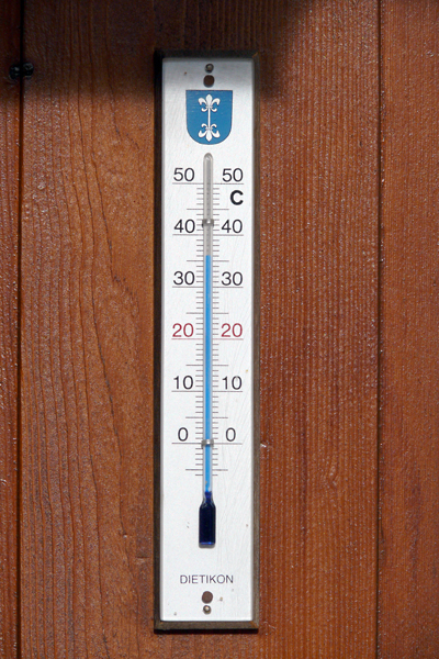 Wer am 20. November nach Klosters fährt, muss mit Schnee rechnen. Als wir am Freitagabend für das erste Probenwochenende in die Höhe fuhren, gab es aber nur Föhn, etwas Regen, und weit und breit keinen Schnee. Wir durften zwei Tage im Ferienhaus der Gemeinde Dietikon verbringen (danke Corinne) und staunten nicht schlecht, dass wir am Samstag unser Mittagessen im Freien unter strahlendem Sonnenschein einnehmen konnten. Das hauseigene Thermometer (siehe Bild) zeigte weit über 30 Grad im Halbschatten.